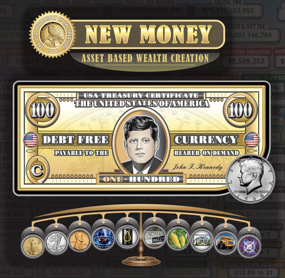 This depiction of our new currency from the US Debt Clock the other day, says USA Treasury Certificate! An instrument of the Positive Economy!!! On the bottom is the scale of assets backing this new currency - Gold, Silver, Copper, Gas, Oil, the Stock Market, Agriculture, Construction, Mining, and Free Energy in the form of Thorium - all in balance with each other.